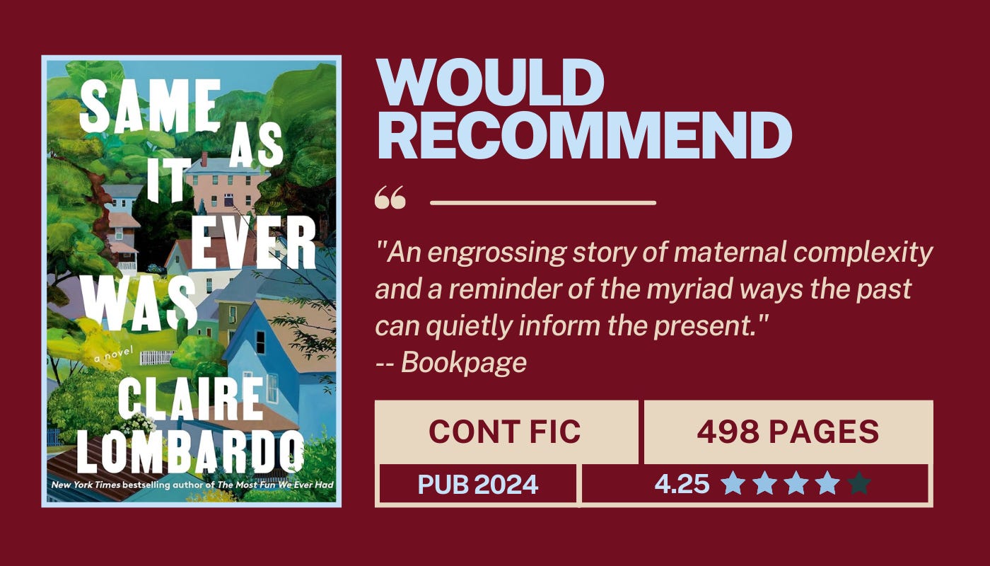 After reading Lombardo’s The Most Fun We Ever Had, her sophomore novel shot straight to the top of my TBR3. This was a completely different reading experience, but still powerful and gripping. This book follows a Gen X mother named Julia through several phases of her life, alternating between the present as an almost-empty-nester, her past as a young woman, and, subsequently, a young mother. Lombardo illustrates how a single chance encounter can alter the course of our lives forever, depicted through a relationship between Julia and an older woman, Helen, who Julis meets during a difficult time in her life. Julia’s relationship with Helen sets off an unexpected and often unpleasant chain of events, affecting every conceivable nook and cranny of her existence. We follow along as Julia experiences challenges in her relationships with her mother, her children, her husband, Helen, and herself, feeling the intergenerational effects of each. Even a life of intense peaks and valleys may feel the same as it ever was when you’re navigating it one day at a time. Only when you turn and look back at it as a whole do you realize how much you’ve endured and enjoyed. Read when you’re feeling frustrated and not sure how to move forward.