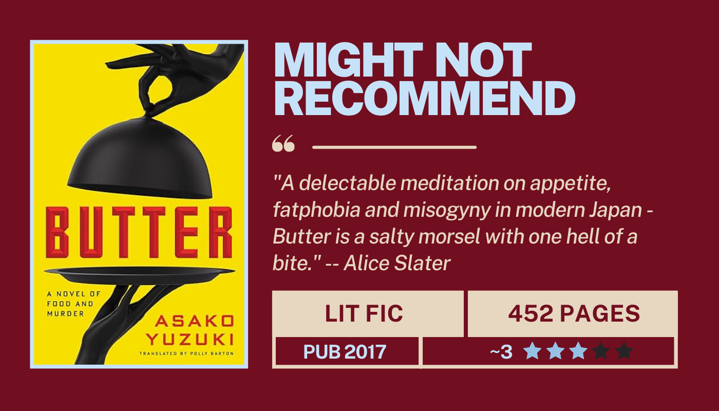 I am very sad to report that this book disappointed me greatly. Everything about it sounds exactly like something I would love (The Guardian calls it “a tasty exposé of fatphobia and trauma”). The book seeks to expose the ways we classify women’s worthiness according to their body size, their relationship to food and domesticity, and the misogynistic undertones of society. I absolutely think that a lot of the intended effect was literally lost in translation as this book was originally a Japanese best-seller. While I really appreciated the intent and general ethos of the book, the actual reading experience was seemingly endless. I had to force myself to finish, which I only did because of how endeared I was to the book by its synopsis. We follow a journalist who becomes enamored with a brazen, imprisoned female serial killer who lured men with her cooking before killing them, inspired by the real life Konkatsu Killer. At the end of the day, this book is about taking up space and prioritizing your pleasure as a woman, renouncing the heavy expectations society places on us to serve everyone else over ourselves and to cater not only our appearances but our existences to the whims of others. How can I disagree with that? Read when you’re ready to be hungry and hate the patriarchy (more).