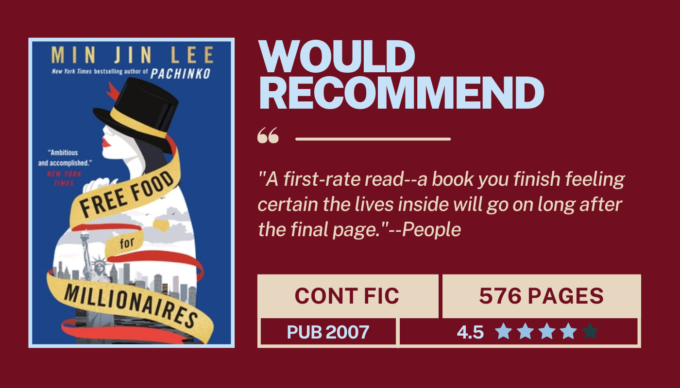 I’ve heard endless praise for Min Jin Lee’s Pachinko, but have never heard anyone talk about her debut novel. If you read this (and you should), please be sure to read her foreword where she discusses her very non-linear journey to becoming a published author. It was incredibly inspiring. The book largely follows a young Korean-American daughter of immigrants named Casey Han as she embarks on early adulthood in 1990s New York City. After she falls out with her family and has nowhere to turn, a run-in with an acquaintance sets her on a new path. We follow Casey as she navigates love, career, and finding purpose as she struggles to make something of herself in a city full of privilege, little of which has made its way to her. Casey is constantly surrounded by secondhand glamour without experiencing any of it for herself. The name of the novel comes from the free lunches served to the affluent staff of the investment bank where she works, a stark contrast to the physically demanding and unrewarding dry cleaning business her parents run. The book seamlessly and extremely subtly slides between perspectives of those who know Casey, giving it a comprehensive omniscience. Lee tackles race, class, the difference in cultural expectations, and more in this sweeping and expansive intergenerational story. Read when you’re craving the feeling that reading Real Americans gave you (or read that after this!).