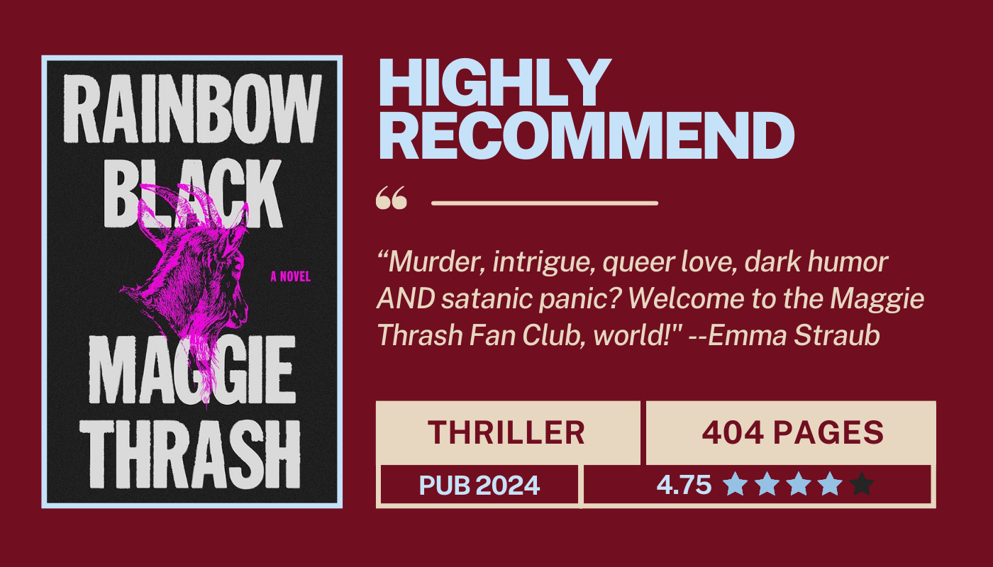This is the longest book I have read in one sitting as an adult, and I cannot think of higher praise than that. I can’t remember who I saw recommend this on TikTok (it was probably Celine or Bridget) but I immediately grabbed it from the library and found myself awake way past my bedtime, completely engrossed. Lacey Bond has a seemingly satisfactory life in the 1980s, living on a farm with her mother and father who run a daycare from their home. One day, Lacey’s life is upended when her parents are accused of and arrested for dozens of horrific acts allegedly perpetrated against the children who attend the daycare. The accusations against her parents are inspired by real life events that occurred during the Satanic Panic of the 80s2, particularly the McMartin Daycare case. Following the arrest, Lacey’s circumstances continue to spiral as she endures loss and finds love in the unlikeliest of people and places. This book is a complex look at queer relationships, the way our past can consume our present, and identity in all senses of the term. Read when you have a fully free evening to dedicate.