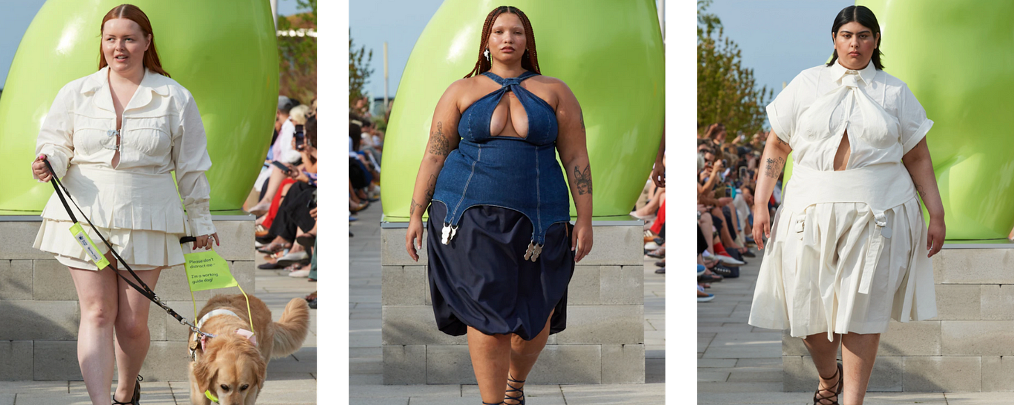 I mean come on!! I’ve been in a very disheartening mental place this week while doing some research for a piece about the (abysmal) state of plus size fashion, and this revitalized me. Not just flat stomached, tiny waisted, big hipped hourglass “plus” models, but big women with familiar proportions, on the runway and looking fucking great. This is what we need more of. See all the looks here. Also, that green blob behind them is a female form sculpture and it’s all so very cool. NYFW has been so boring for so long - take me to Copenhagen baby!!!