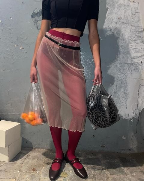 I’ve written recently about the sudden increased popularity of tights - Cami Tellez’s new venture, Sabrina Carpenter’s tights as a portent for customized tights with typography hitting the mainstream. I feel we’re getting closer every day! The colored tights trend is yet another form of customization for your outfits as we work towards more individualism + identity in fashion, and away from minimalism / quiet luxury (and a natural progression of the no pants “trend”)