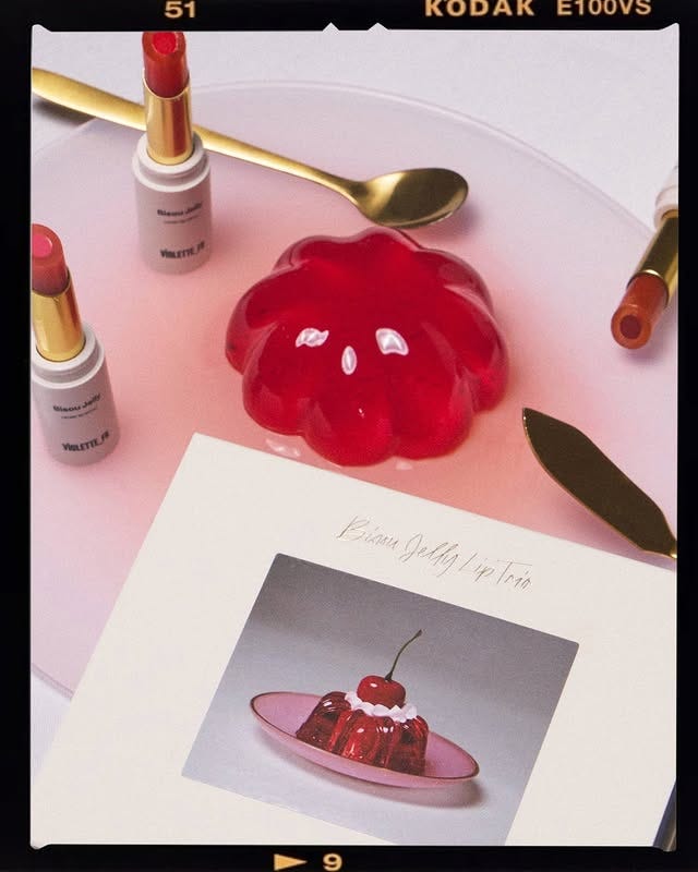 Jello mold sighting! Violette_Fr launched a limited-edition set of their Bisou Jelly Lip Balms and used jiggly jello on the packaging and in the marketing materials, right on par with one of my top predicted trends for the year