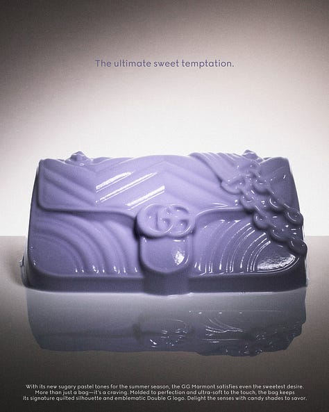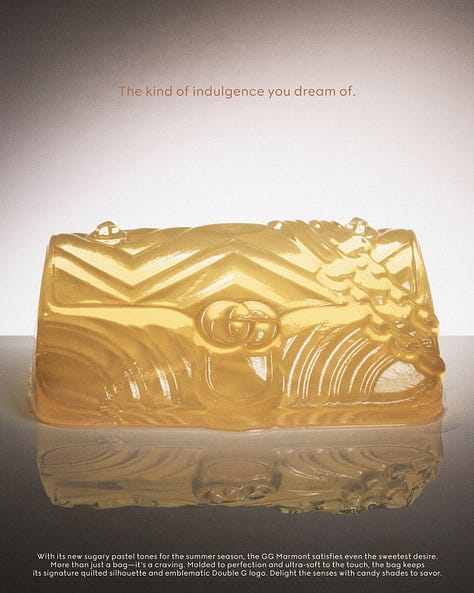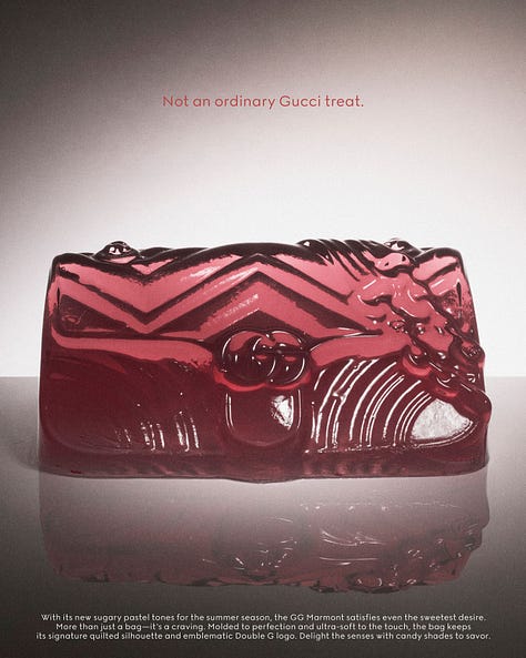This week, Gucci released this campaign featuring jello molded GG Marmont bags. Taglines from the campaign read “dessert isn’t just for the table”, “a perfect recipe every time”, and “the kind of indulgence you dream of”.