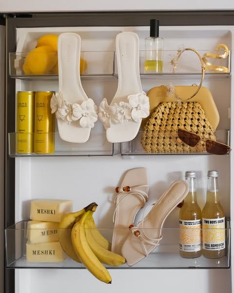 Exhibit A: This Meshki post which includes not only butter and bananas side by side with tonally coordinating shoes inside a fridge, but also some lemons.