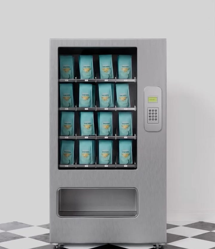 Prada Beauty has been building up to the release of their Prada Balm in banana yellow, which is inspired by a banana fabric print from their SS 2011 collection. I really love this whole thing. Also - note the vending machine for none other than banana JELLIES! This will make sense in a moment.